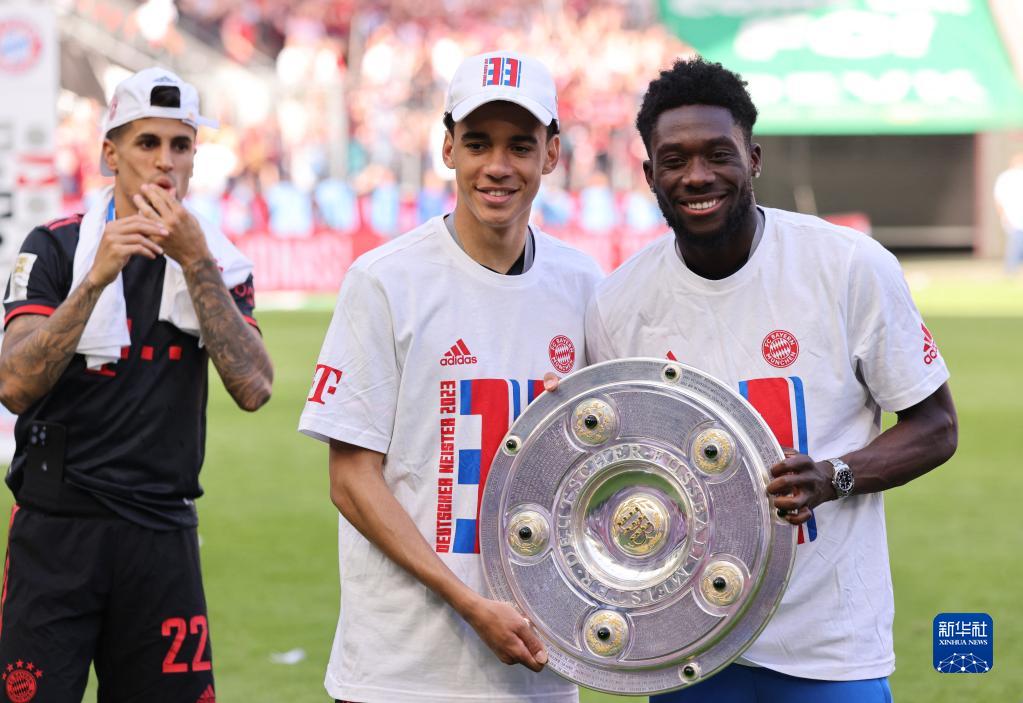 5月27日,拜仁慕尼黑队球员穆夏拉(中)与队友阿方索·戴维斯(右)在比赛后捧起冠军奖盘庆祝。新华社/路透