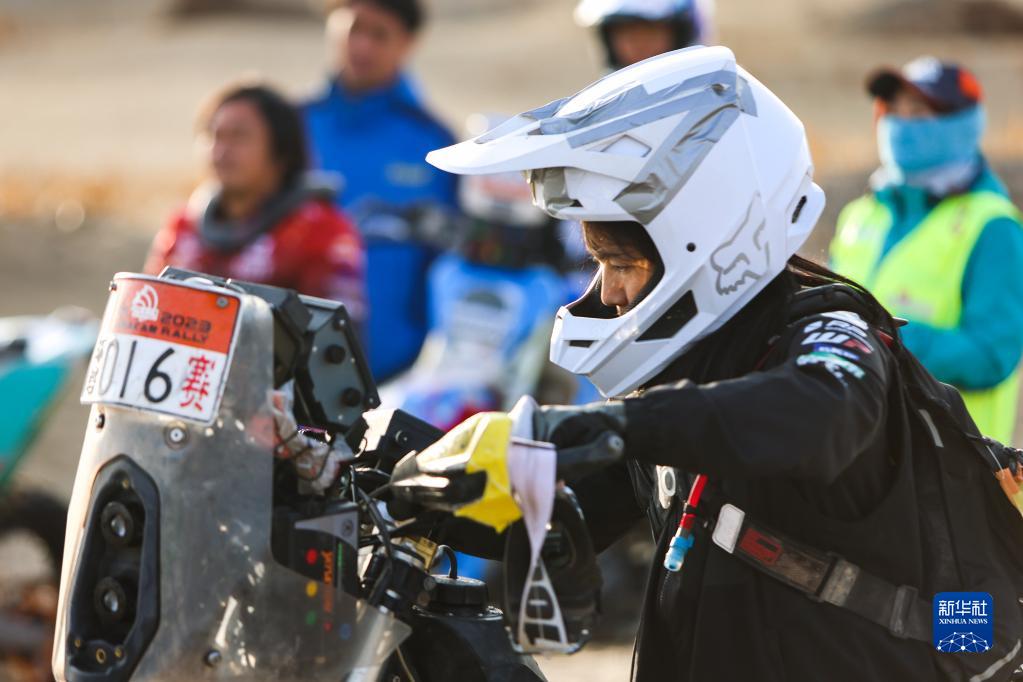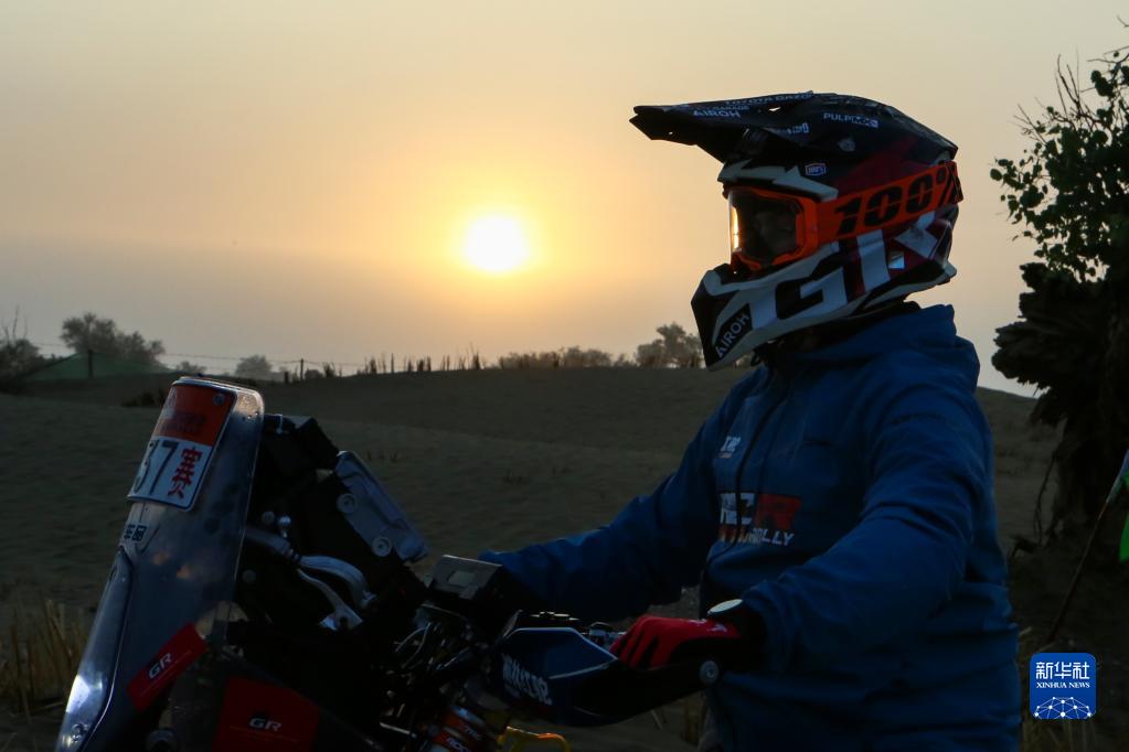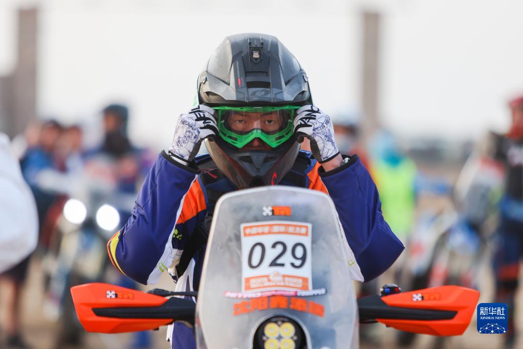 5月28日,沈阳鑫添瑞车队车手胡博淋在出发前整理护目镜。新华社记者 郝昭 摄