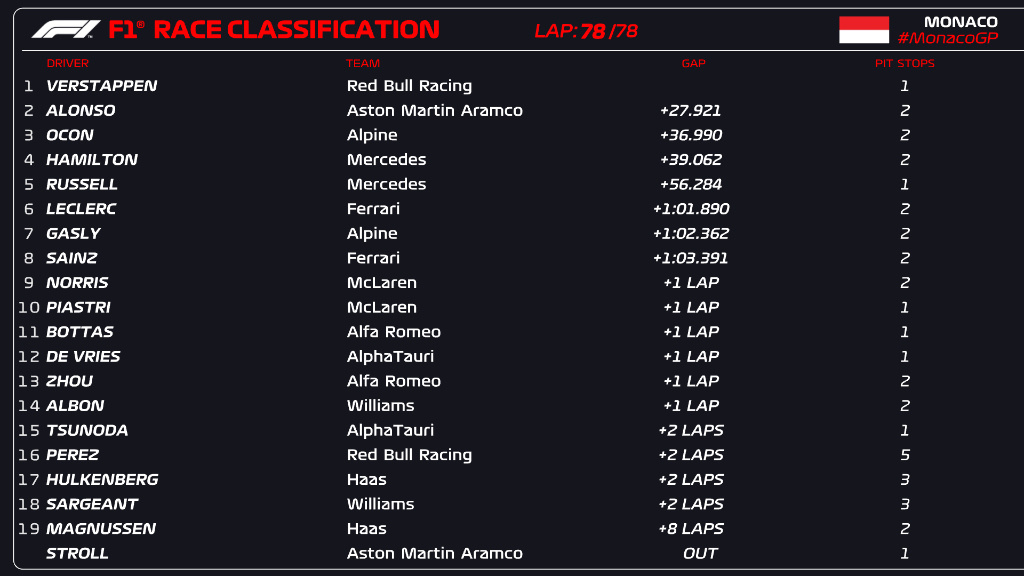 维斯塔潘杆位发车,并在几圈后就迅速拉开差距。作为全年平均速度最低的一站比赛,摩纳哥站街道赛的特点让超车变得更加困难,多名车手在尝试超车时发生碰撞。