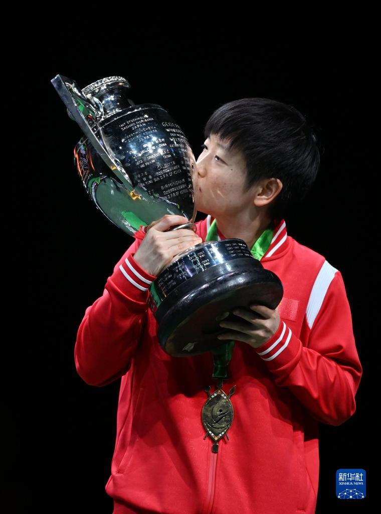 5月28日,孙颖莎亲吻冠军奖杯。新华社记者 陶希夷 摄