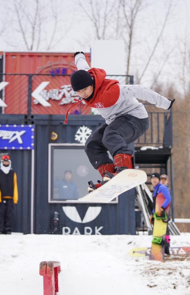 图为吉林市V-PARK地形公园工作人员在场地道具上滑行。新华社记者 颜麟蕴 摄