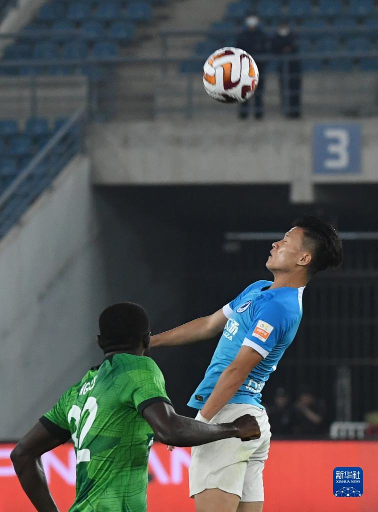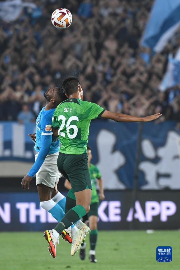 6月9日,大连人队球员曼佐基(左)与北京国安队球员柏杨在比赛中争顶。新华社记者 陈为 摄