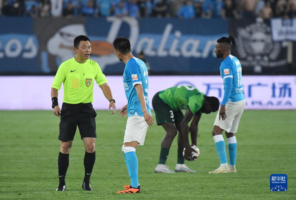 6月9日,大连人队球员吕鹏(左二)在比赛中与主裁判交流。新华社记者 陈为 摄
