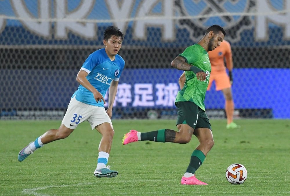 6月9日,北京国安队球员德索萨(右)在比赛中带球进攻。新华社记者陈为摄