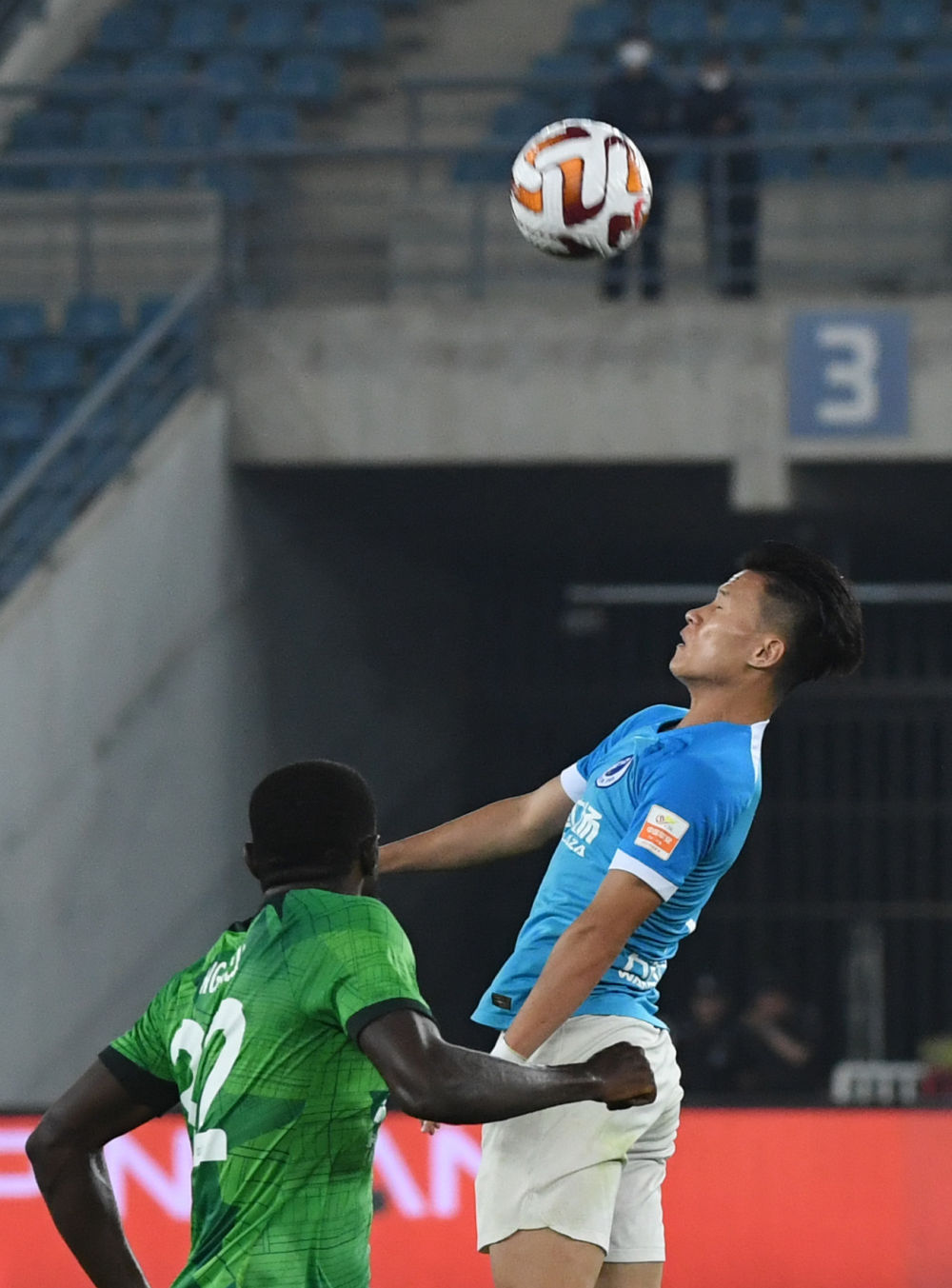 6月9日,大连人队球员林良铭(右)在比赛中争顶。新华社记者陈为摄