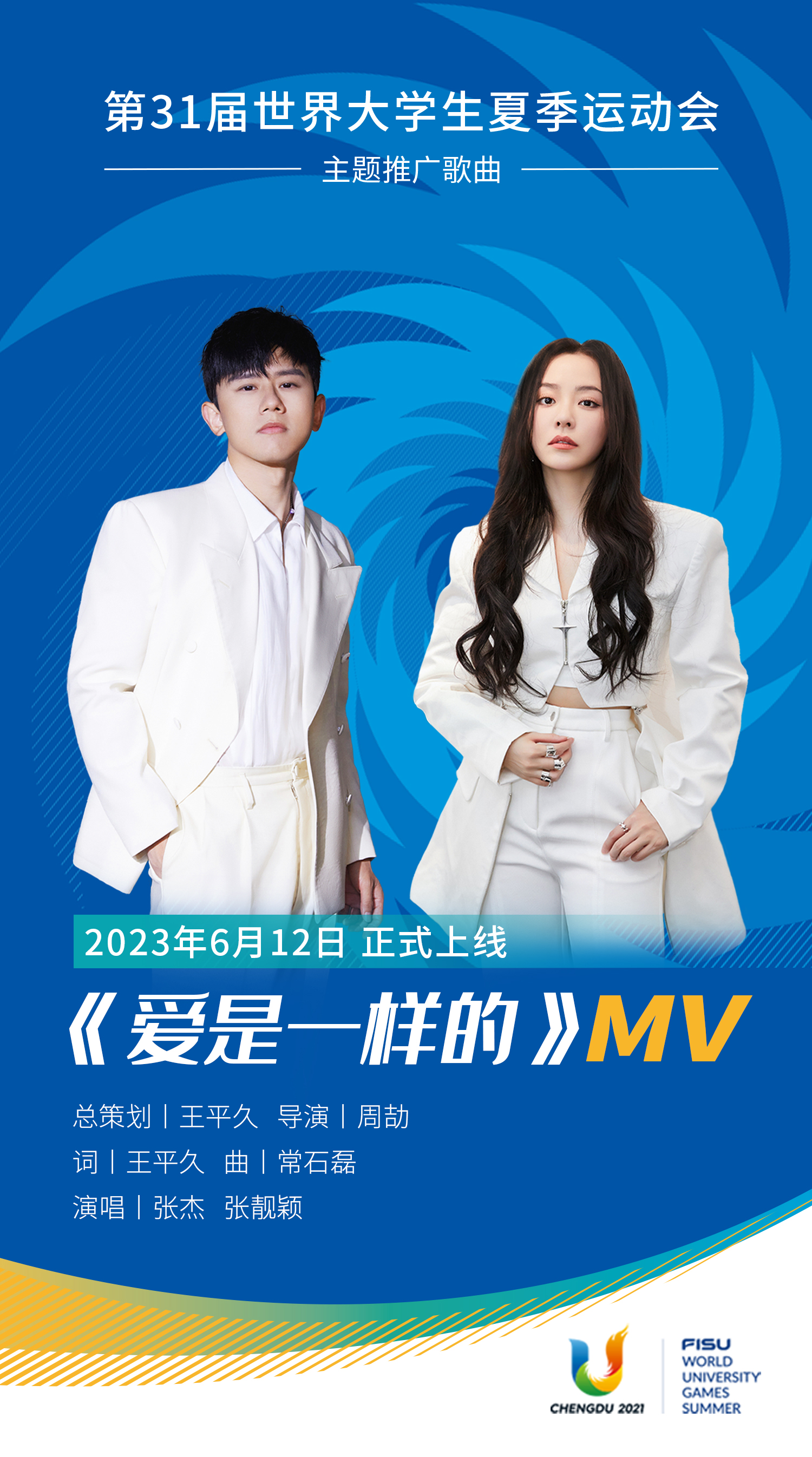 6月12日,成都大运会主题推广歌曲《爱是一样的(Together Forever)》官方MV全球发布!这支MV由张杰、张靓颖演唱并出演。来自世界各地的青年,以赛事与友谊为桥,穿越城市,跨过山海,集聚在体育场,蓄势待发的弦音托举梦想踏上征程。