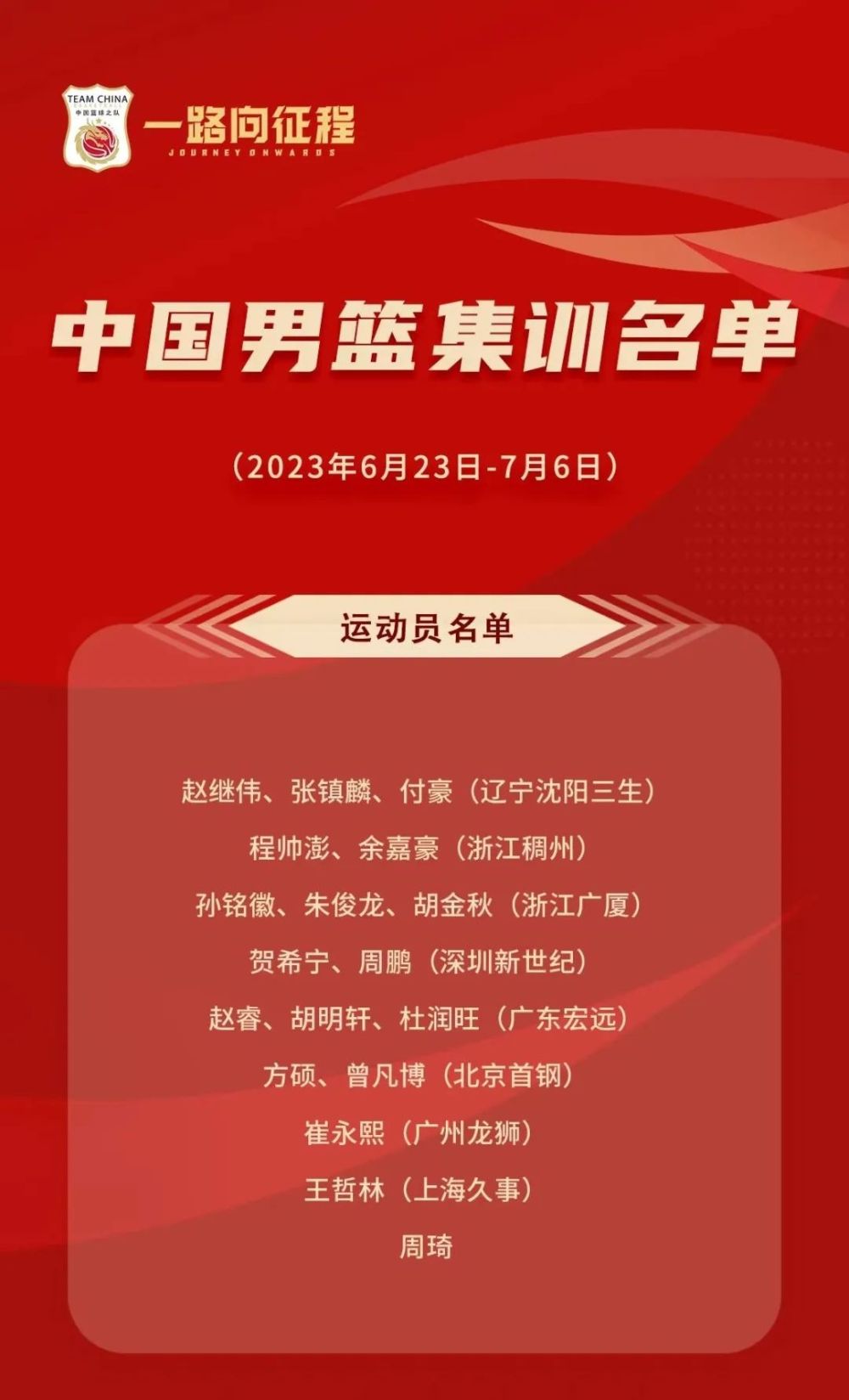 本次集训选拔将于6月23日至7月6日在青岛国信篮球训练基地进行。入选的18位球员是赵继伟、张镇麟、付豪、贺希宁、周鹏、方硕、曾凡博、余嘉豪、程帅澎、孙铭徽、朱俊龙、胡金秋、崔永熙、胡明轩、赵睿、杜润旺、王哲林、周琦。比较引人关注的是,最近几年国家队的常客郭艾伦和吴前没有入选。