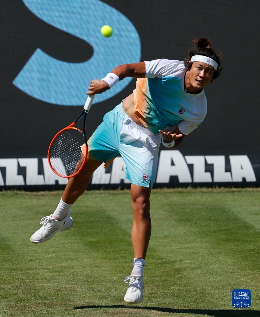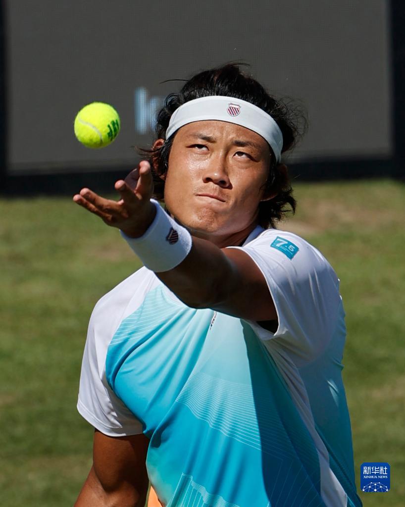 6月13日,张之臻在比赛中发球。新华社发(菲利普·鲁伊兹 摄)