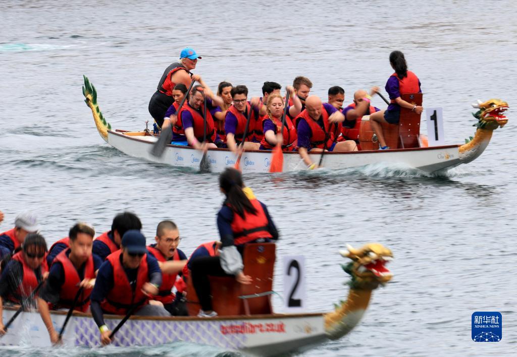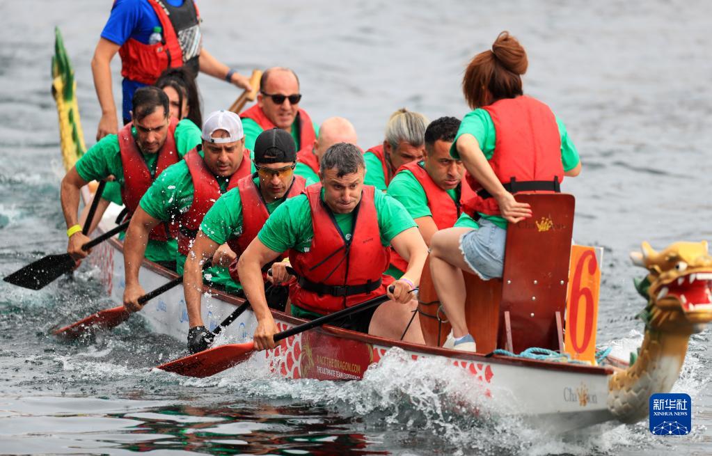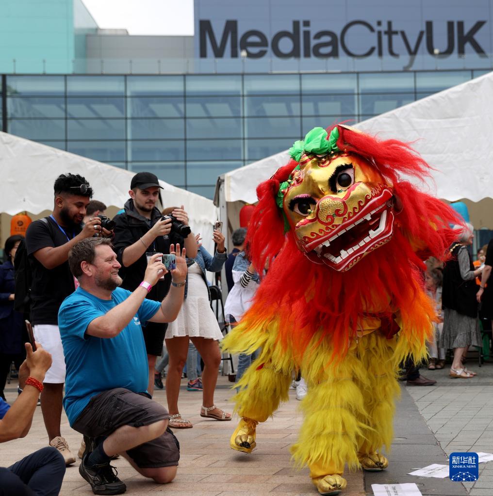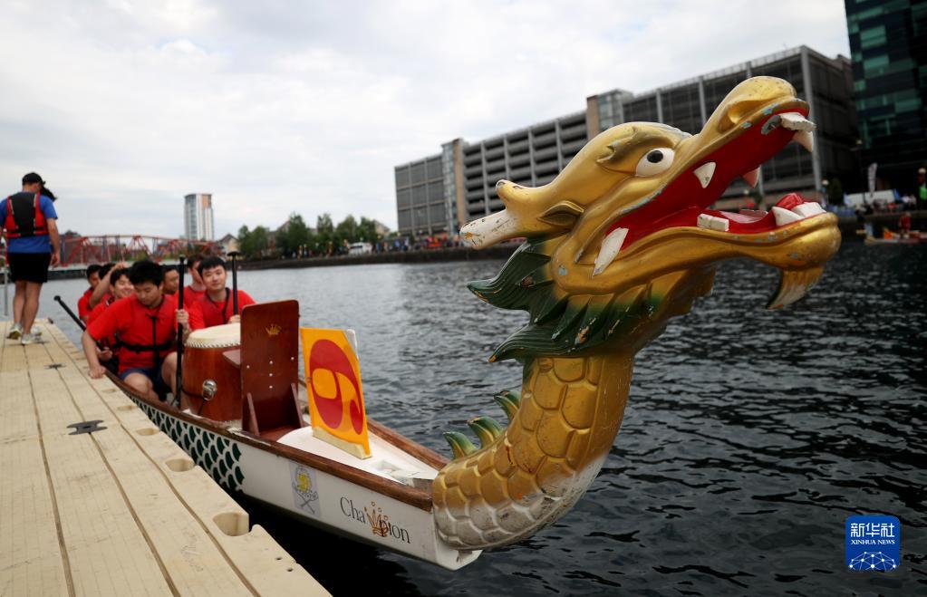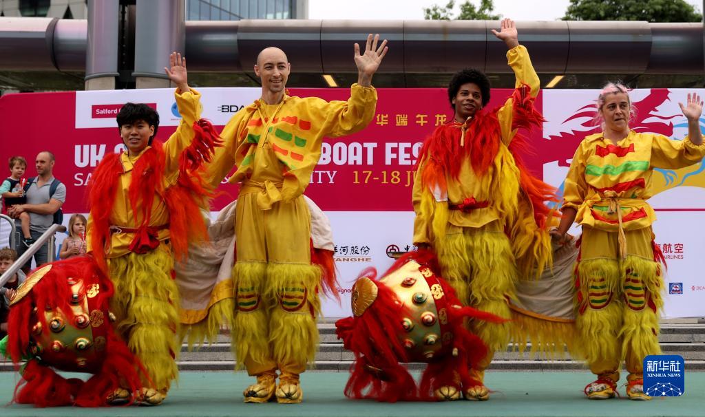 当日,2023年全英中华端午龙舟会在英国索尔福德市的古运河上开幕。在今年的龙舟会上,共有50多支队伍参加比赛,选手们用这种方式共同迎接端午节。除了龙舟比赛,主办方还在比赛场地组织了中国特色的表演节目,包括武术、舞龙舞狮、传统舞蹈、书法展示等,多方位展示中华传统文化。
