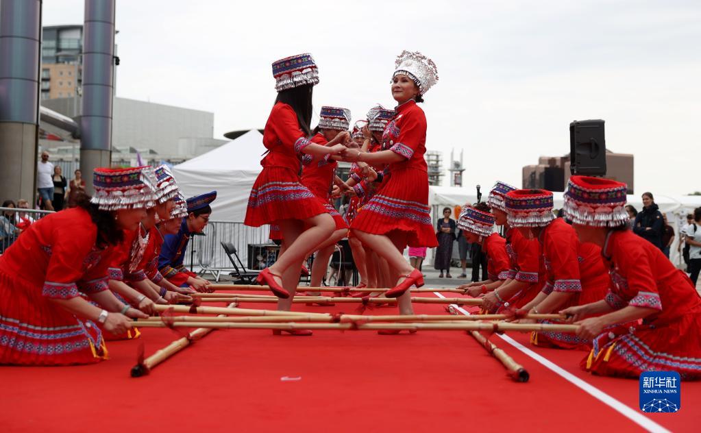 6月17日,在“全英中华端午龙舟会”上,演员表演“竹竿舞”。新华社记者 李颖 摄