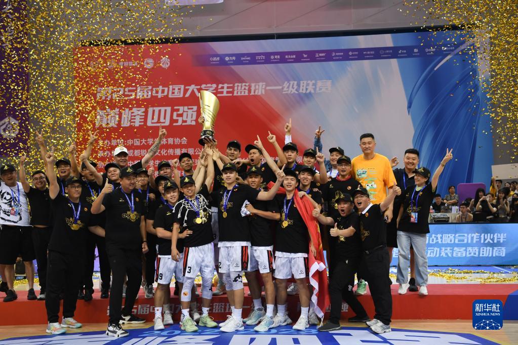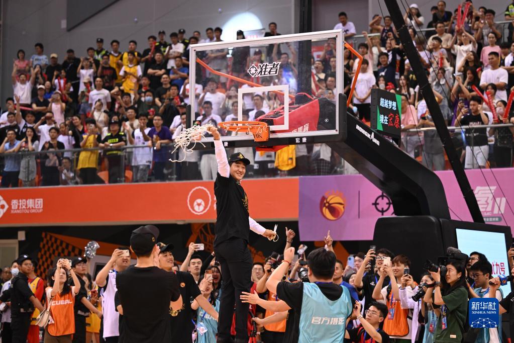 6月18日,广东工业大学队主教练于广龙(前上)在球队夺冠后剪下篮网庆祝。新华社记者 胥冰洁 摄