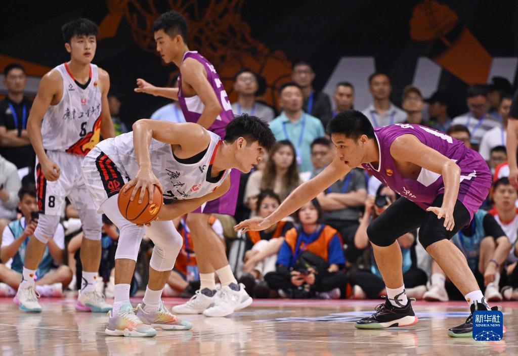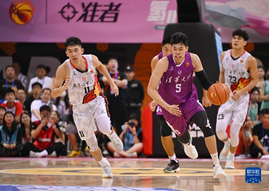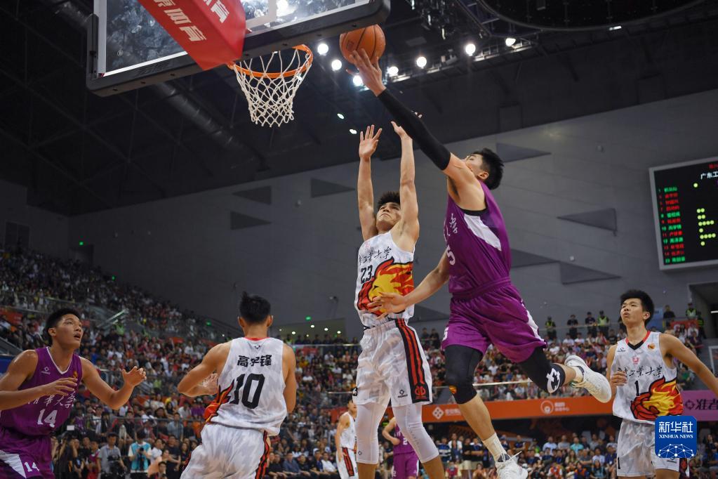 6月18日,广东工业大学队球员陈国豪(右三)在比赛中防守清华大学队球员邹阳(右二)。新华社记者 胥冰洁 摄