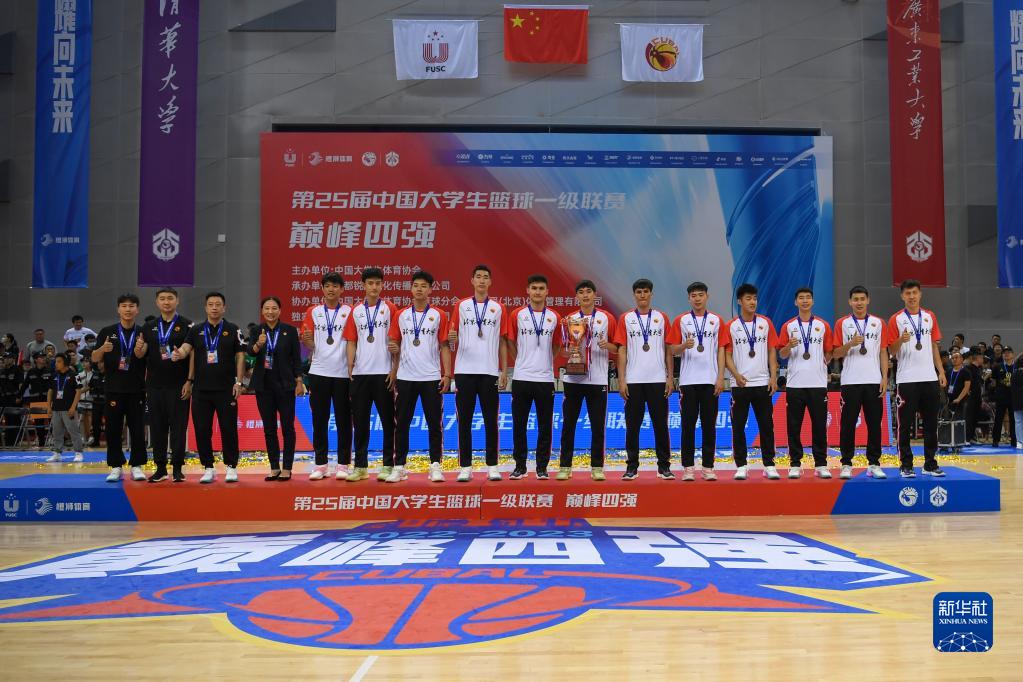 6月18日,季军北京体育大学队在领奖台上合影。新华社记者 胥冰洁 摄
