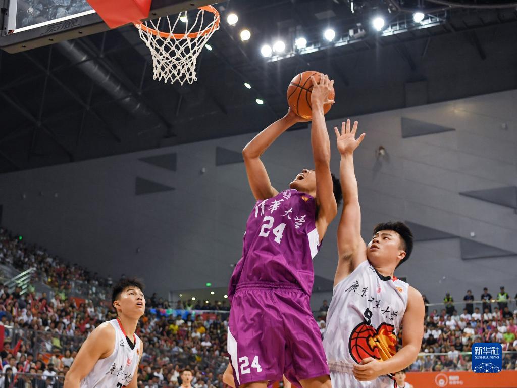 6月18日,清华大学队球员逄砚钧(右二)在比赛中上篮。新华社记者 胥冰洁 摄