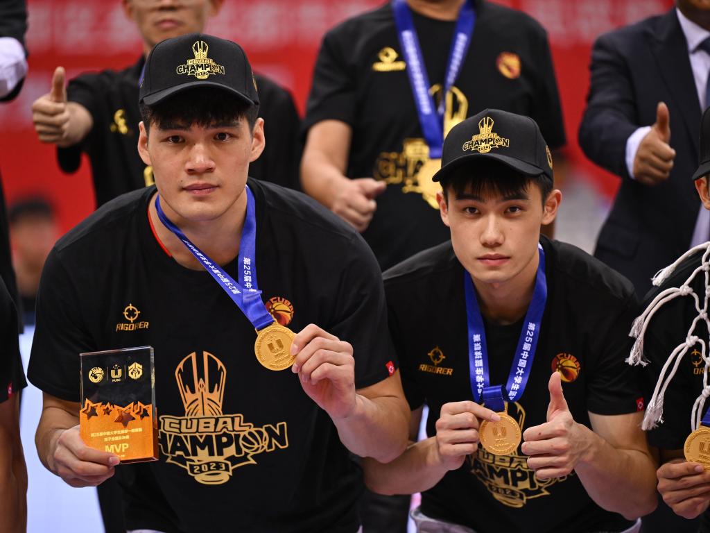 6月18日,广东工业大学队球员陈国豪(左)和邵炜昀(右)夺冠后留影。新华社记者胥冰洁摄