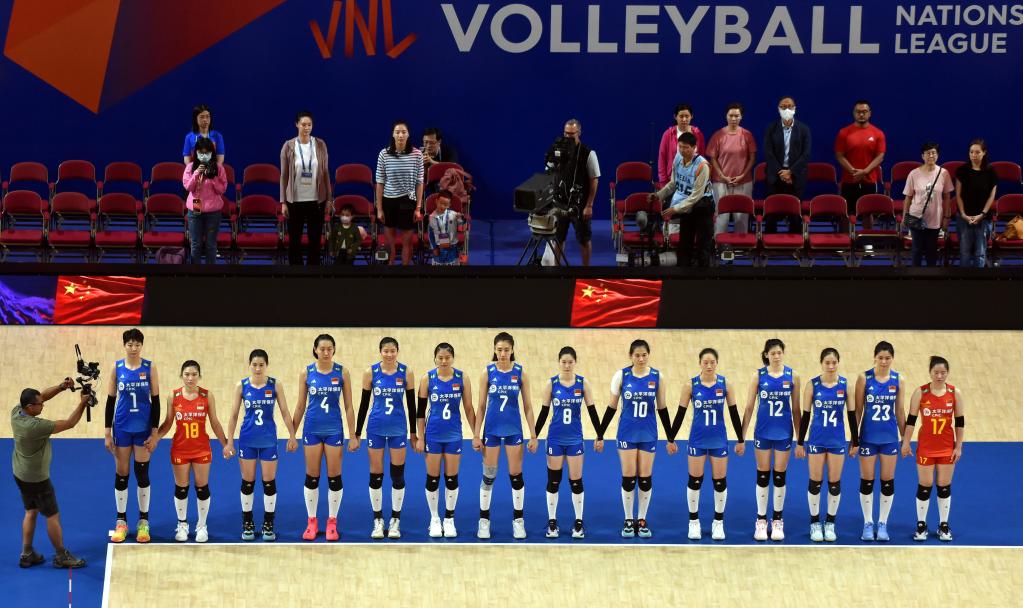 6月16日,中国队球员在出场仪式上。当日,在2023世界女排联赛中国香港站比赛中,中国队以3比1战胜保加利亚队。新华社记者卢炳辉摄