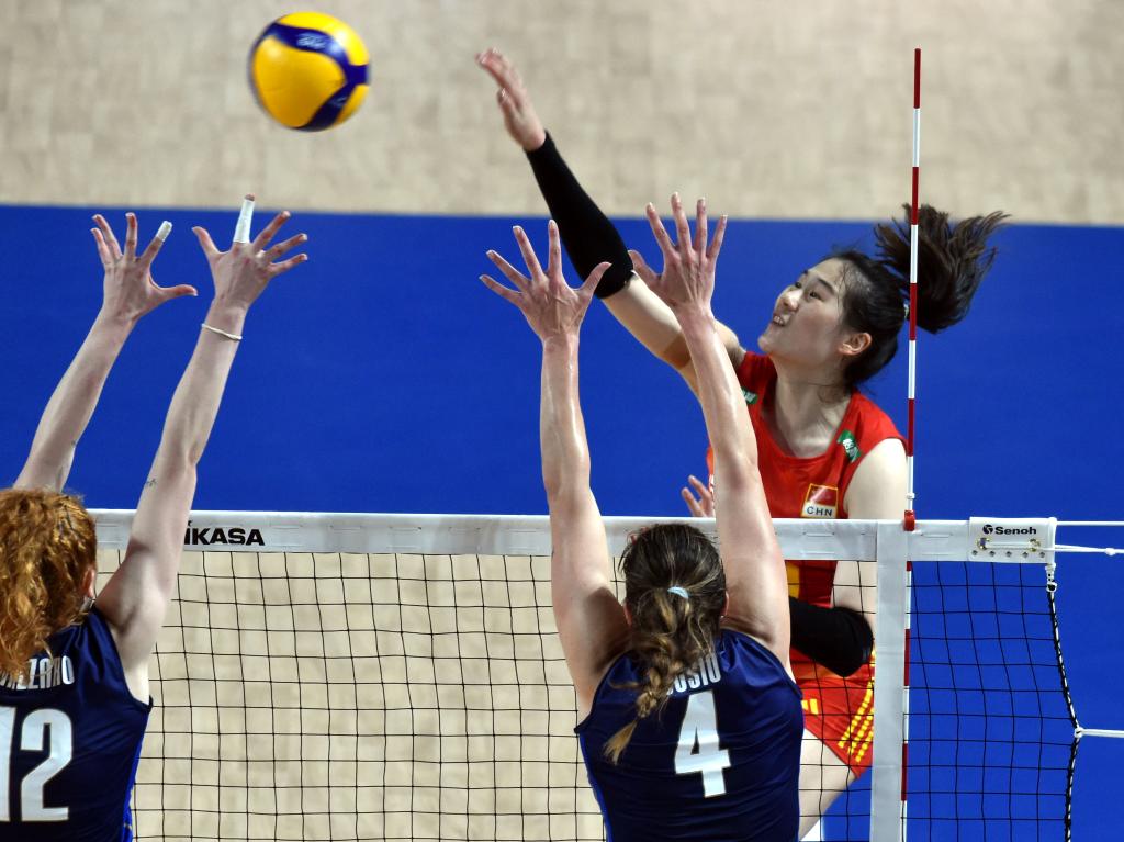 6月18日,中国队球员王云蕗(右)在比赛中扣球。当日,在2023世界女排联赛中国香港站比赛中,中国队以2比3不敌意大利队。新华社记者卢炳辉摄