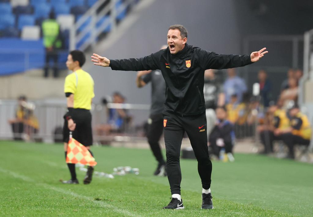 6月20日,中国队主教练扬科维奇(右)在比赛场边指挥。新华社记者 曹灿 摄
