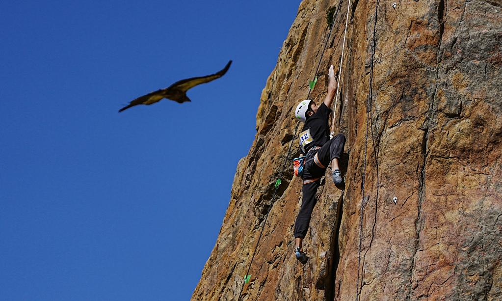 图为选手梅渝坪在攀登岩壁(6月23日摄)。新华社记者 晋美多吉 摄