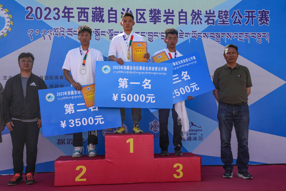 图为2023年西藏自治区攀岩自然岩壁公开赛男子组冠军罗金涛(中)、亚军强巴平措(左二)和季军赤列平措(右二)在颁奖仪式上合影(6月23日摄)。新华社记者 黄耀漫 摄
