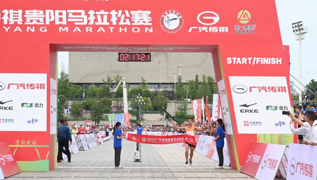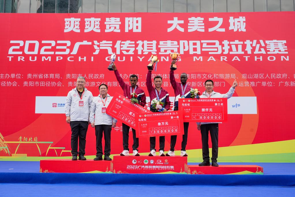 6月10日,岑万江(左四)在贵阳马拉松颁奖仪式上。(受访者供图)