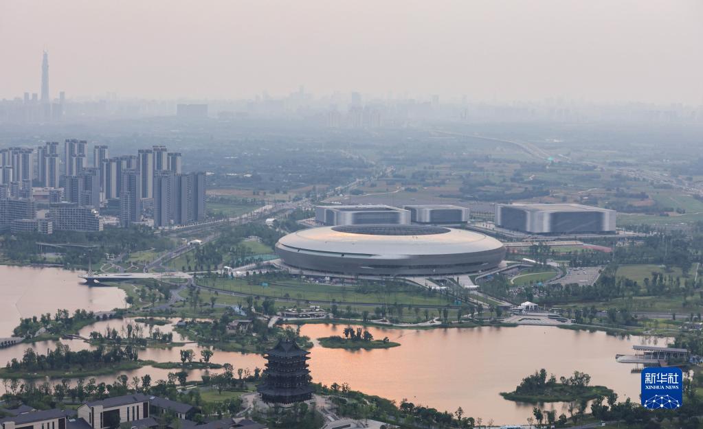 图为俯瞰东安湖体育公园主体育场(左一)、多功能体育馆(右一)、小球馆(右二)、游泳跳水馆(右三)(6月27日摄)。新华社记者 江宏景 摄