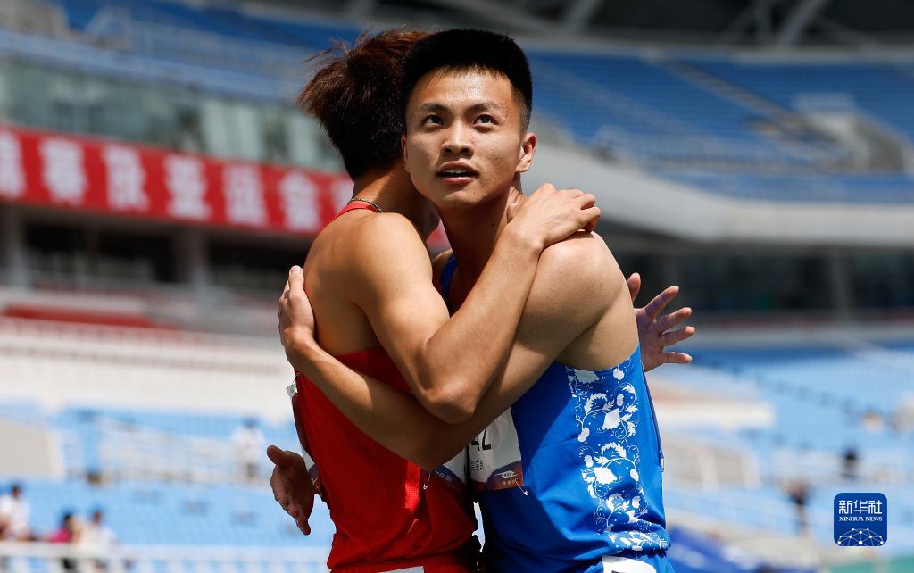 6月28日,江西队选手吴宇昂(右)在男子400米决赛后庆祝。最终,他以46秒27的成绩夺冠。新华社记者 王丽莉 摄
