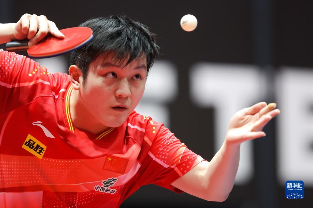 6月29日,中国选手樊振东在男子单打第一轮比赛中发球。最终,他以3比0战胜韩国选手安宰贤,晋级16强。新华社发(Pixsell图片社/卢卡·施坦茨尔摄)