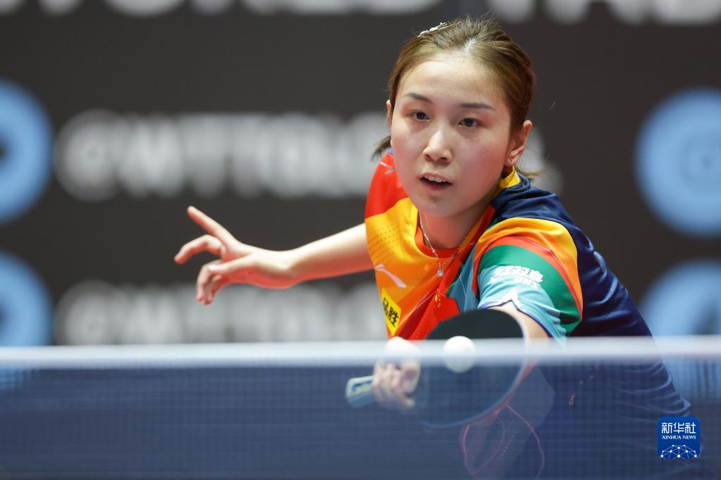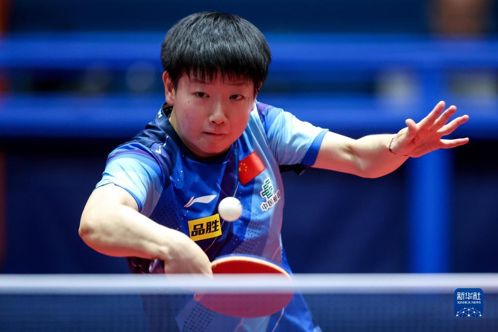 6月29日,中国选手孙颖莎在女子单打第一轮比赛中回球。最终,她以3比0战胜队友何卓佳,晋级16强。新华社发(Pixsell图片社/伊戈尔·克拉利摄)