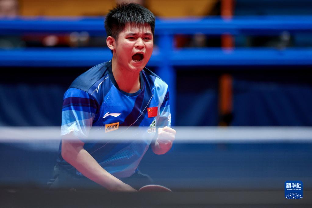 6月29日,中国选手林诗栋在男子单打第一轮比赛中庆祝得分。最终,他以3比2战胜韩国选手赵承敏,晋级16强。新华社发(Pixsell图片社/伊戈尔·克拉利摄)