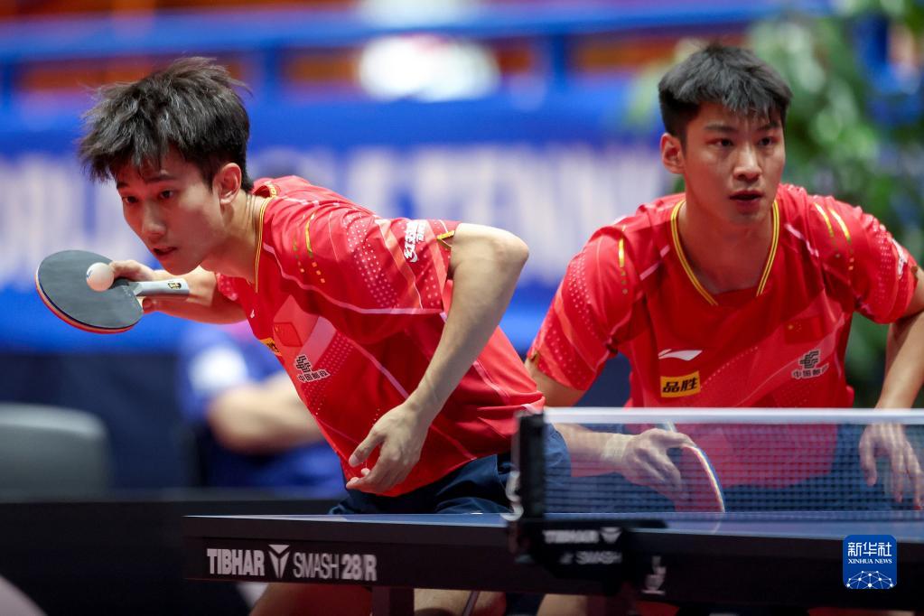 6月29日,中国组合薛飞/梁俨苧(左)在男子双打第一轮比赛中。最终,他们以3比0战胜韩国组合李尚洙/赵大成,晋级八强。新华社发(Pixsell图片社/卢卡·施坦茨尔摄)