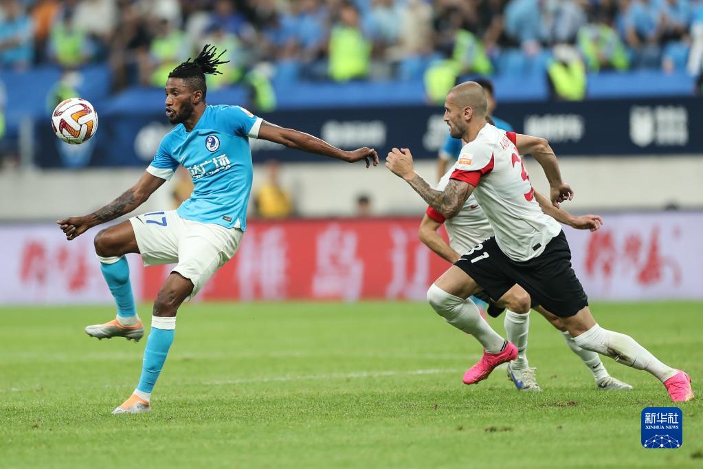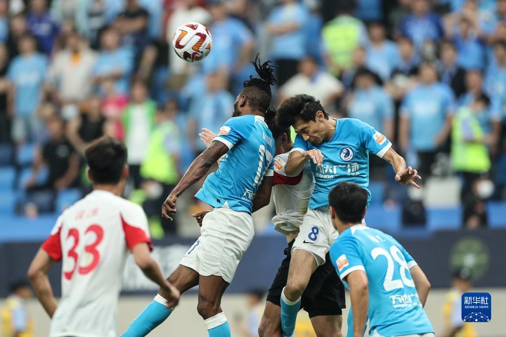 7月2日,青岛海牛队球员康瓜(中)在比赛中争顶。新华社记者 潘昱龙 摄
