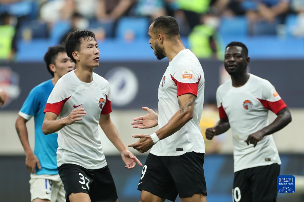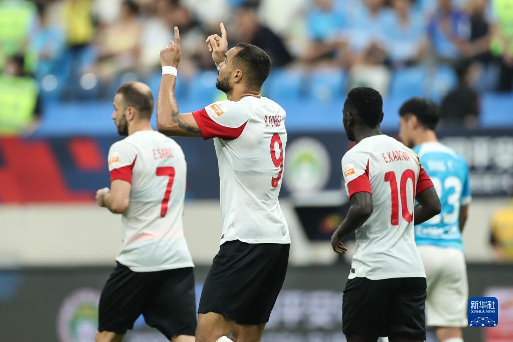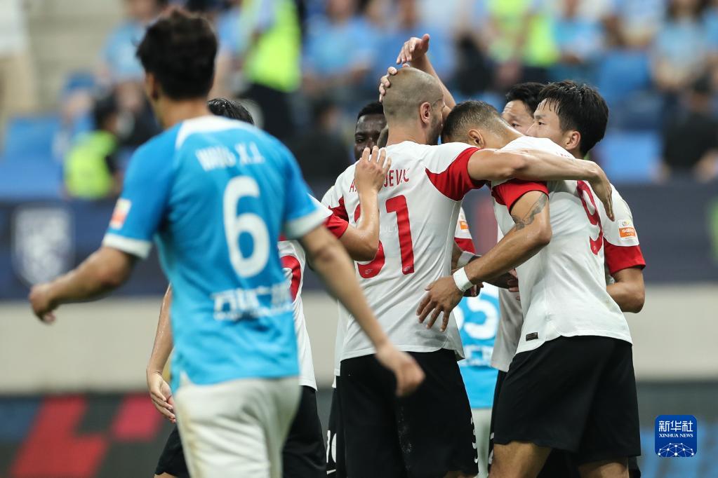 7月2日,青岛海牛队球员在比赛中庆祝进球。新华社记者 潘昱龙 摄