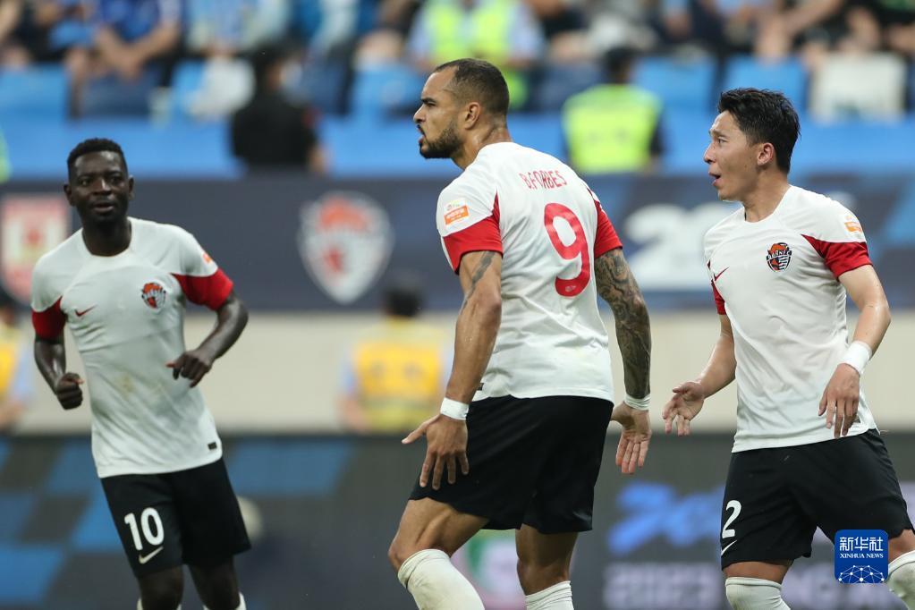 7月2日,青岛海牛队球员福布斯(右二)进球后与队友庆祝。新华社记者 潘昱龙 摄