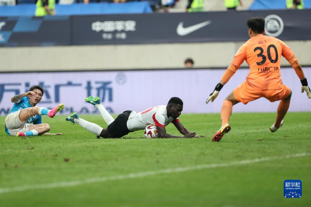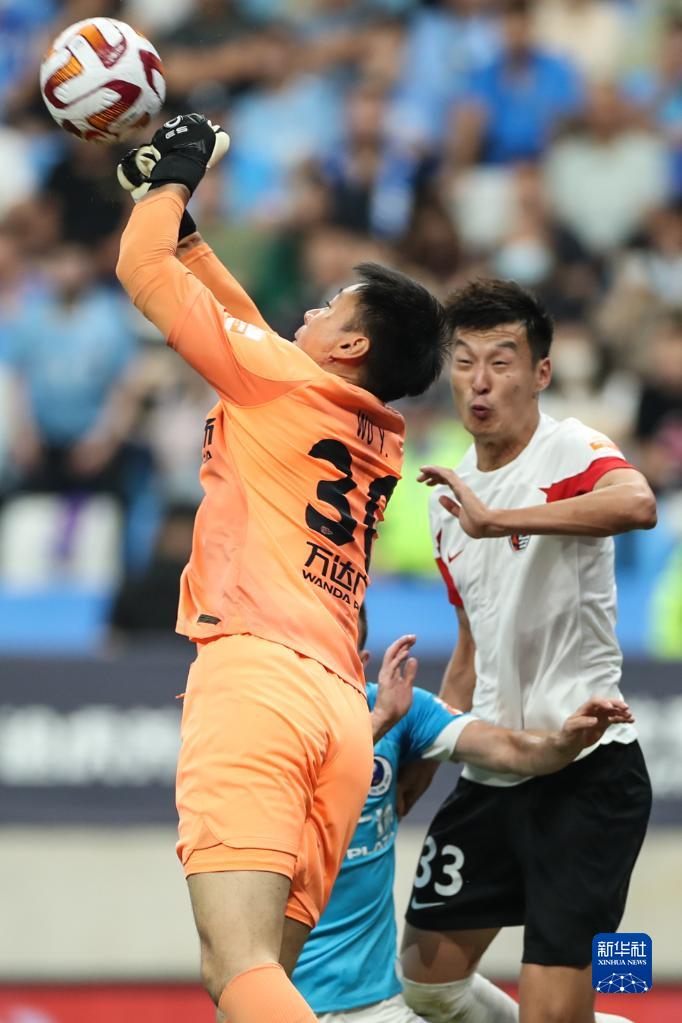 7月2日,大连人队守门员吴䶮(左)在比赛中扑救。新华社记者 潘昱龙 摄