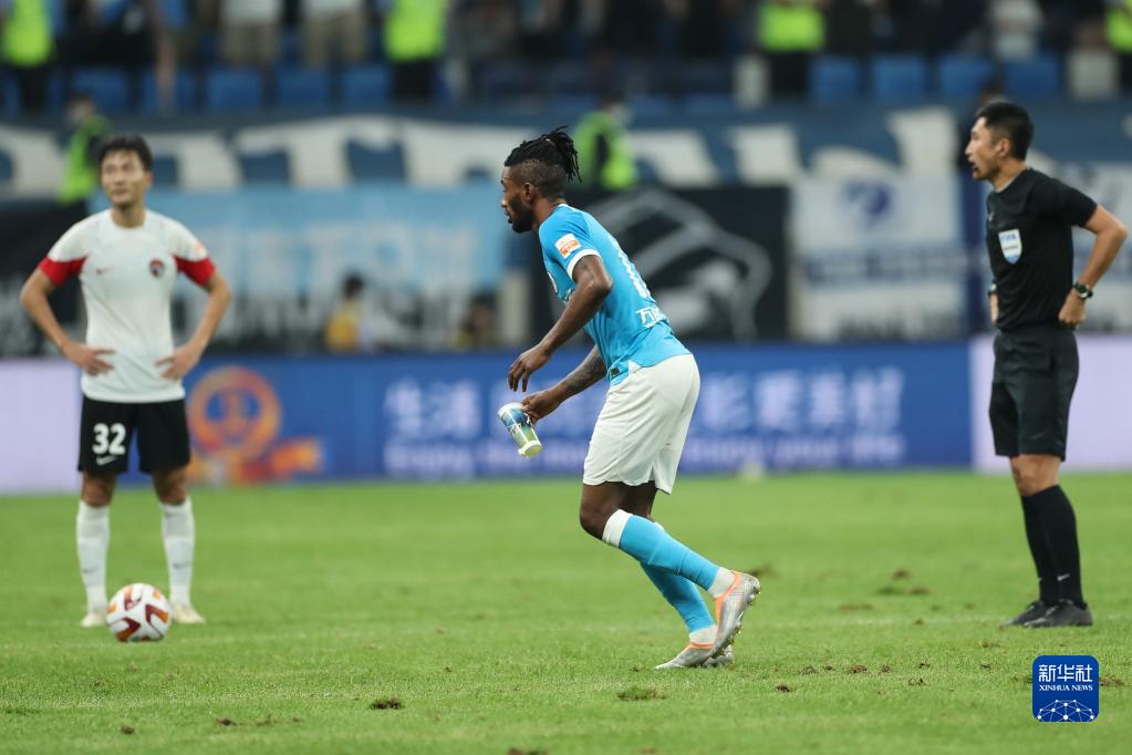 7月2日,大连人队球员曼佐基洛比(中)将场内的饮料杯拿出场外。新华社记者 潘昱龙 摄
