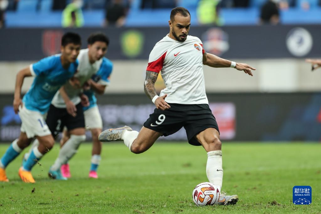 7月2日,青岛海牛队球员福布斯在比赛中主罚点球。新华社记者 潘昱龙 摄