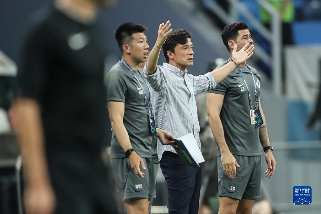 7月2日,大连人队主教练谢晖(右二)在比赛中。新华社记者 潘昱龙 摄