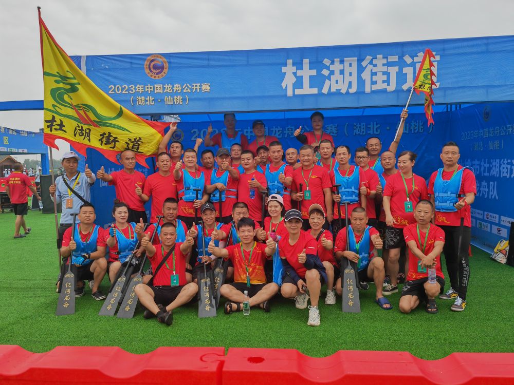 2023年7月1日,仙桃市杜湖街道仁河龙舟队全体队员在赛前合影留念。(受访者供图)