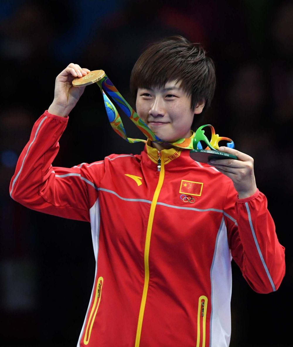 2016年8月10日,丁宁在里约奥运会乒乓球女单决赛领奖台上。新华社记者蔺以光摄