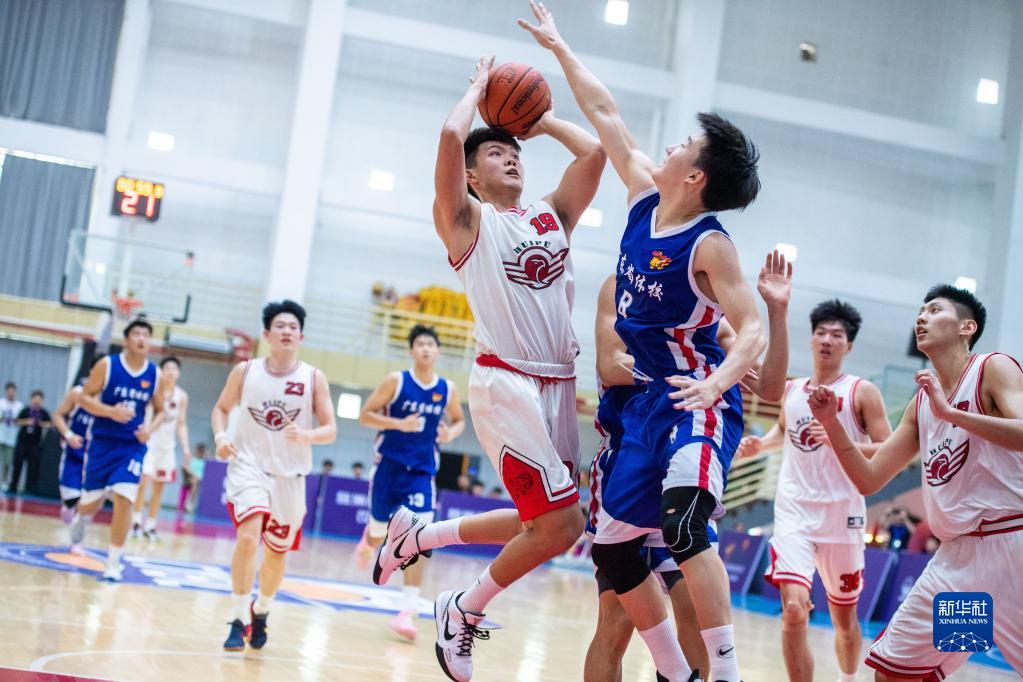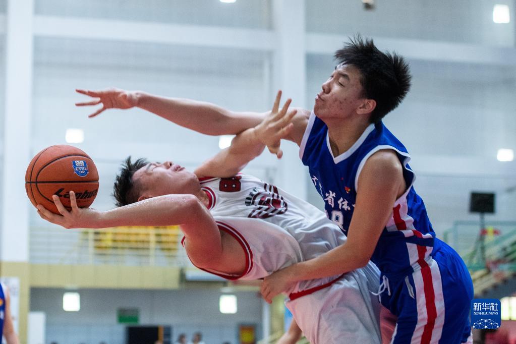 7月5日,广东省体校队球员常泽宇(右)封盖浙江回浦中学队球员吴一锐。新华社记者 陈思汗 摄