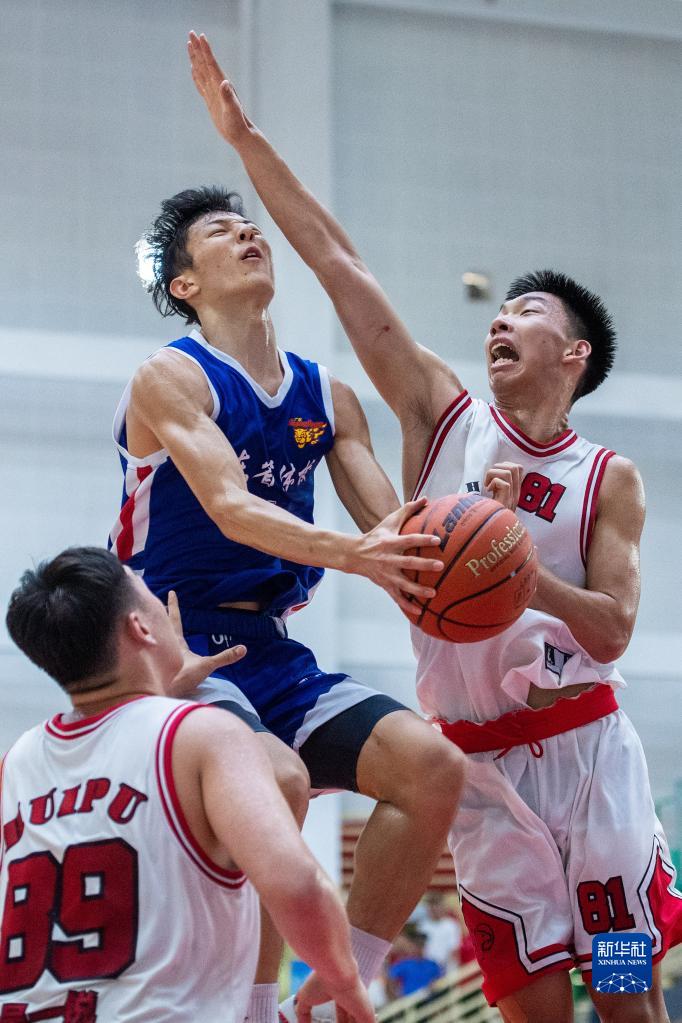 7月5日,浙江回浦中学队球员洪珉俊(右)防守广东省体校队球员张文浩(中)。新华社记者 陈思汗 摄