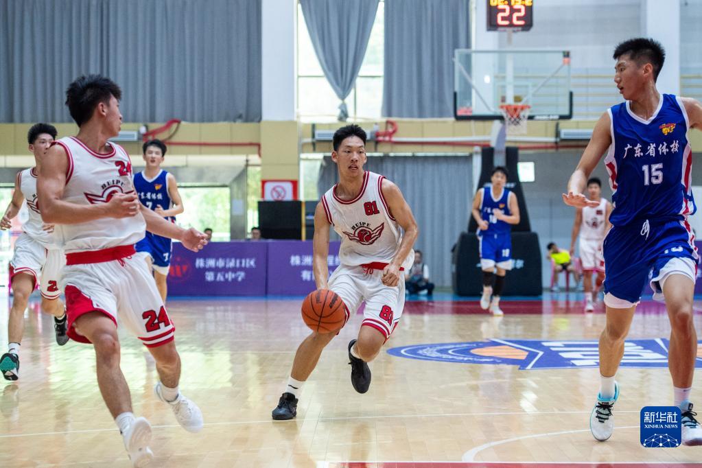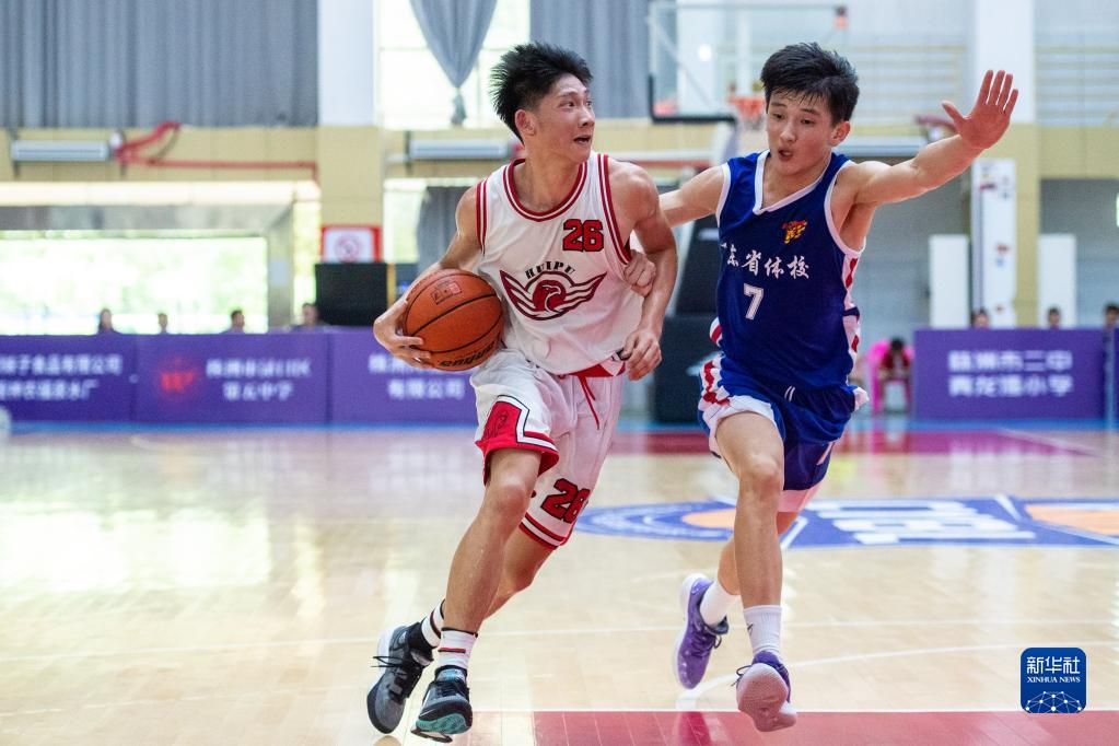 7月5日,广东省体校队球员缪雨阳(右)防守浙江回浦中学队球员吴畅畅。新华社记者 陈思汗 摄