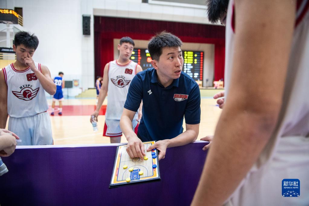 7月5日,浙江回浦中学队助理教练孙庚在比赛暂停时布置战术。新华社记者 陈思汗 摄