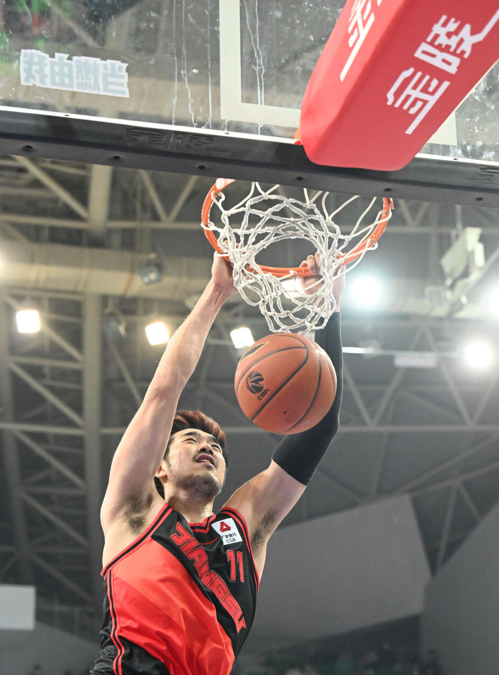 3月4日,吴冠希在2022-2023赛季中国男子篮球职业联赛(CBA)常规赛的比赛中扣篮。新华社记者 孙凡越 摄