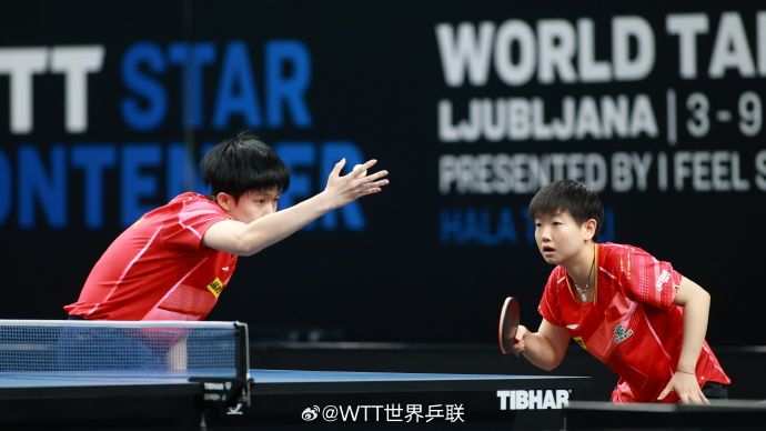 王楚钦(左)与孙颖莎在世界乒乓球职业大联盟(WTT)卢布尔雅那球星挑战赛的比赛中。图片来自WTT世界乒联社交媒体官方账号