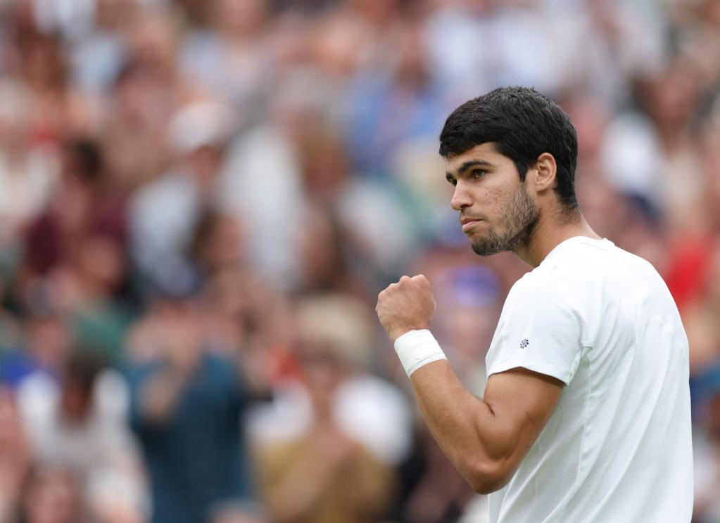 7月8日,阿尔卡拉斯在比赛中庆祝得分。新华社记者 韩岩 摄