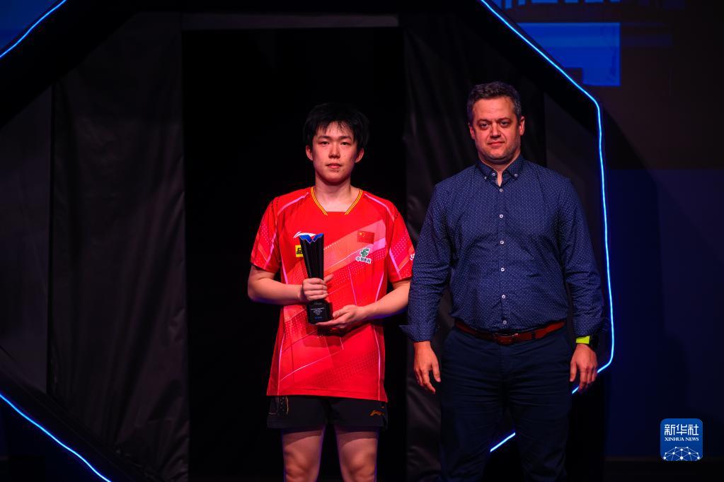 7月9日,王楚钦(左)在颁奖典礼上。新华社发(亚卡·埃尔采戈夫切维奇摄)