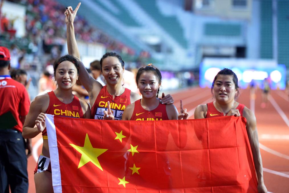 7月12日,中国队选手葛曼棋、韦永丽、梁小静和袁琦琦(从左至右)在女子4×100米接力决赛后合影。新华社发(拉亨摄)