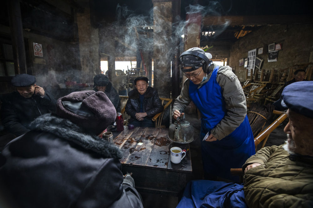 老板李强忙着为老街坊们续水